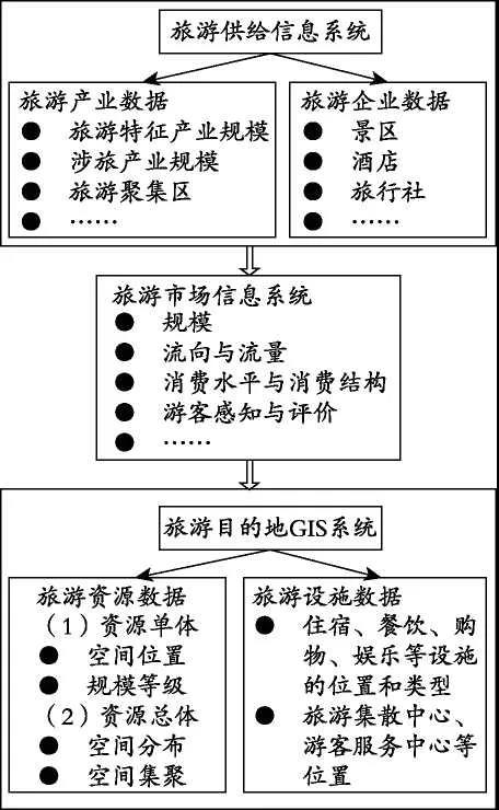 Data from different channels are collected by different means, and the collected data are cleaned and classified, and stored in the database according to the hierarchical classification principle to form a tourism database. The database can be divided into tourism supply information system, tourism market information system and tourism destination GIS system, as shown in Figure 2.