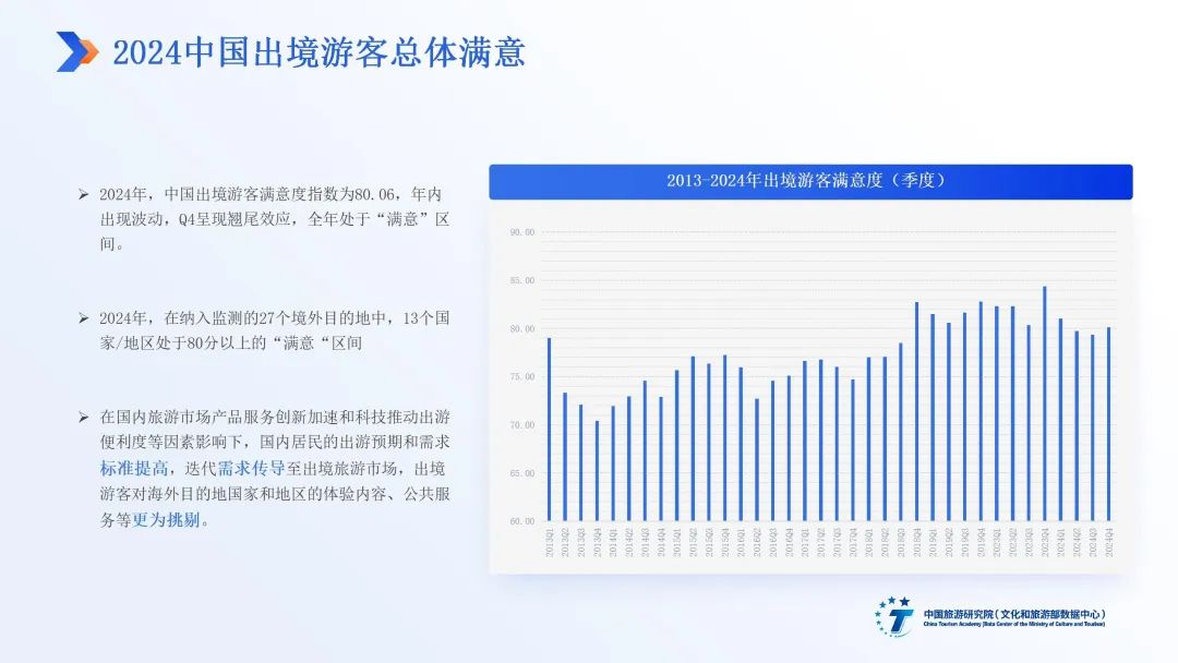 2024年,中国公民出境旅游人数 1.23亿人次,出境旅游市场稳步复苏。国内旅游市场创新加速推动国内居民的出游预期和需求标准提高,迭代需求传导至出境旅游市场,出境游客对海外目的地国家和地区的体验内容、公共服务等更为挑剔。2024年,中国出境游客满意度指数为80.06,年内出现波动,全年处于“满意”区间。