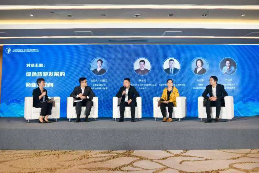 “绿色旅游发展的商业新动向”专题对话环节,韩晋芳博士与深圳市深巴文化旅游发展有限公司市场总监杨嘉伦,邯郸市文体旅产业集团有限公司总经理蒿静飞,马蜂窝目的地研究院院长孙云蕾,树蛙部落创始人、乡意文旅董事长付丛伟进行了专题研讨,对话嘉宾围绕企业如何践行绿色旅游理念展开讨论,从企业业务层面分享了自己的观点。