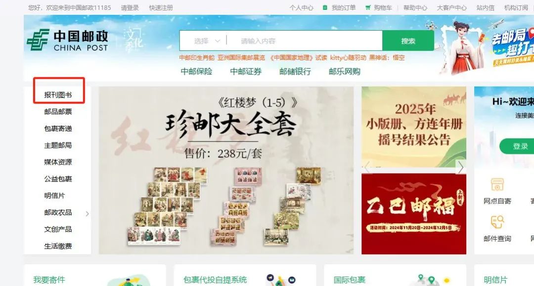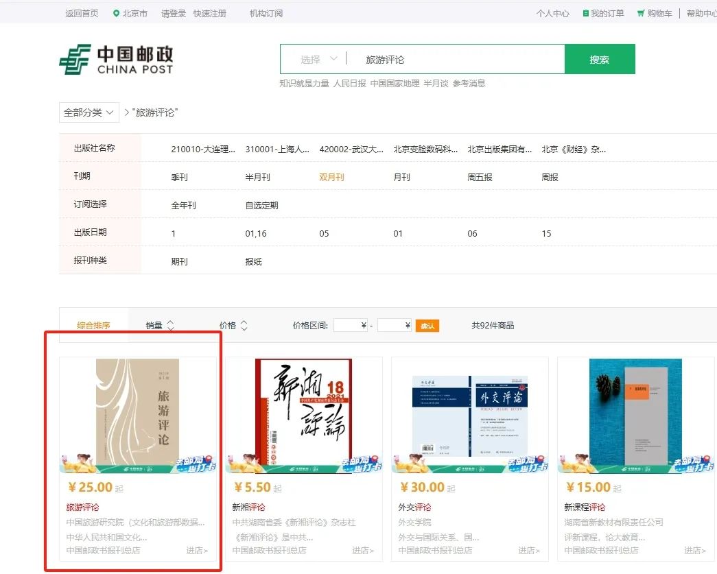 方式1:登录中国邮政网上营业厅(PC电脑端:https://www.星空彩票手机开户85.cn),在“邮务业务”板块中选择“报刊图书”,在搜索栏中输入“旅游评论”。
