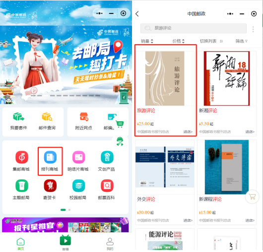 方式2:登录微信“中国邮政商城”官方小程序,选择“报刊商城”板块,搜索“旅游评论”。