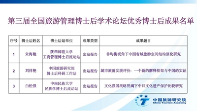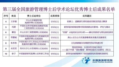 经本届全国旅游管理博士后学术论坛评选,共10项博士后成果入选本届论坛优秀成果名单,其中2项成果获得首批中国旅游研究院博士后文库项目资助。具体名单如下: