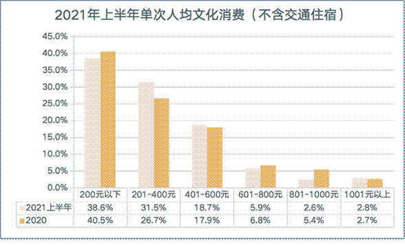文化消费水平相对平稳,产业带动呈倍增趋势。2021年上半年,城乡居民单次人均文化消费主要集中在200元以下、201-400元区间。相比2020年,200元以下人均消费(38.6%)的比重相对缩减,201-400元(31.5%)、401-600元(18.7%)的比重增加,考虑到人力、物价等综合变动,人均文化消费水平相对平稳。文化消费对交通、餐饮、商业等周边产业带动发挥积极作用,专项调研数据显示,周边产业消费主要集中在201-400元(30%)、401-600元(35%)。