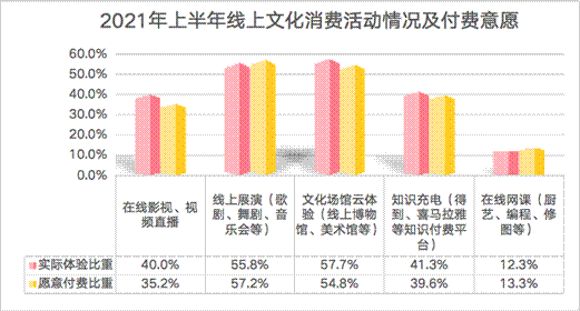 线上与线下文化消费场景已深度嵌入居民日常生活。2021年上半年,广大人民群众积极参与线上展演(55.8%)、文化场馆云体验(57.7%)、知识充电(41.3%)、在线影视和视频直播(40%)、在线网课(12.3%)等活动。线上文化消费活动的丰富和完善也激发了消费者付费体验的意愿,愿意为线上展演和文化场馆云体验付费的受访者比重较高。线下场景中,文化场馆(博物馆、文化馆、纪念馆、图书馆、美术馆等)、都市商圈及休闲街区、综合性文化服务中心(社区、乡镇)、旅游景区等线下场景依靠内容和服务创新努力为人民群众营造优质文化消费空间。