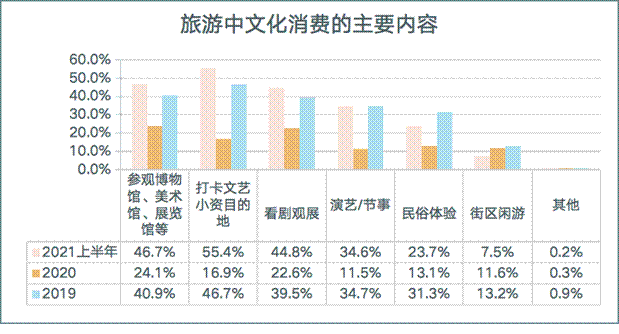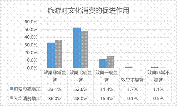 文化体验成为异地旅游和拉动消费的主要内容。专项调研显示,2021年上半年,九成受访者会在旅游中进行文化消费活动,其中文化场馆参观(46.7%)、打卡文艺小资目的地(55.4%)、看剧观展(44.8%)、演艺/节事(34.6%)等体验方式日益多元。文化体验有效带动了消费,51.7%的受访者文化消费支出占旅游总花费的10%-30%,35.2%的受访者文化消费支出占旅游总花费的30%-60%。游客对美好目的地的期待不再局限于自然风光,异域文化、人文风情、市井烟火成为休闲消费的重要选项。对于旅游促进文化消费的效果,超过八成受访企业表示旅游对于文化消费频率和人均消费金额的增加有比较显著或非常显著的促进效果。