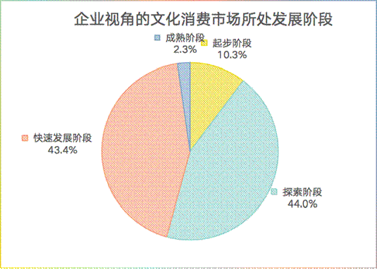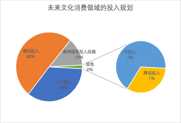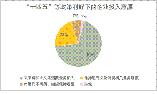 消费释放和政策促进等多重利好有效推动产业投资。针对文化消费市场发展,44%的企业认为文化消费市场处于探索阶段,43.4%的企业认为文化消费市场处于快速发展阶段,这也间接表明文化消费市场未来可开发、可探索的空间广阔。刚刚公布的“十四五”文化和旅游发展规划中提出的文化和旅游消费促进政策,拟在十四五期间建设国家文化和旅游消费示范城市、区域文化和旅游消费中心等政策,文化消费领域迎来重大政策利好环境。在这一背景下,69%的受访企业表示未来将加大文化消费业务投入。
