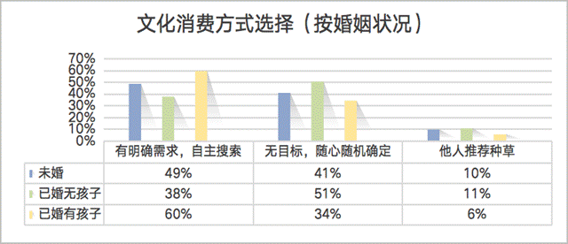 多元需求加速文化消费产品和业态创新。随着人民收入水平提高和文化休闲基础设施的不断普及完善,文化消费群体规模不断扩大,不同收入、家庭、学历的群体消费需求差异不断凸显。从收入构成来看,5000元以下群体的文化消费动机以休闲娱乐型为主,5001-10000元群体的休闲娱乐和功能型偏好比重接近,10000元以上群体的文化消费以功能型(达到知识获取、增加社交等目的)消费为主。从家庭结构来看,已婚有孩家庭基于亲子教育、家庭融合等诉求,对于文化消费的态度更加积极,有明确需求,自主搜索休闲消费的比重达到了60%;其次为未婚家庭,文化消费需求明确且自主搜索的比重为49%;已婚未育家庭更倾向于无目标,随机选择文化消费内容。从年龄角度看,各年龄段群体文化消费时长主要集中在1-3小时和3-6小时,其中,25-34岁、35-44岁群体的文化消费体验主要集中在3-6小时,45-54岁、55岁以上群体的文化消费体验主要集中在1-3小时。未来,可针对不同收入阶层的需求,将休闲娱乐型和功能型文化消费产品进行合理分配;针对不同家庭,充分了解有孩家庭的需求并推送定制化产品,通过短视频等传播渠道扩大品牌效应,增加品牌和产品的曝光度,扩大消费受众;针对不同年龄段群体的偏好,实现不同体验时长产品的精准投放,提高效率增加消费。