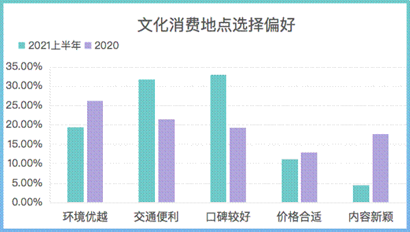 文化消费的核心价值和社交属性更受关注。2021年上半年文化消费的整体满意度86.8,性价比满意85.4,均显著高于上年水平。城乡居民对于当前文化消费供给整体满意,其中群众对于文化消费空间的精神价值有了更高需求,对于消费产品的口碑更加关注。专项调研数据显示, 52.8%的受访者表示目前国内的文化消费场景有利于文化传播和文化自信提升,41.4%的受访者表示文化场景内容丰富提升了文化氛围,49.9%的受访者表示搭建了个体文化表达、情感抒发的平台。相比2020年,2021年上半年城乡居民选择文化消费地点时更加注重口碑(32.9%)和交通(31.8%),其次为环境(19.5%)和价格(11.2%)。居民和游客对文化和旅游休闲过程中的社交体验感、自身参与感、价值认同感等有了更高需求,期待体验更多新业态和新场景,口碑成为实现品质消费的主要渠道。