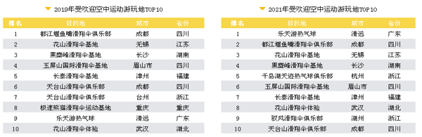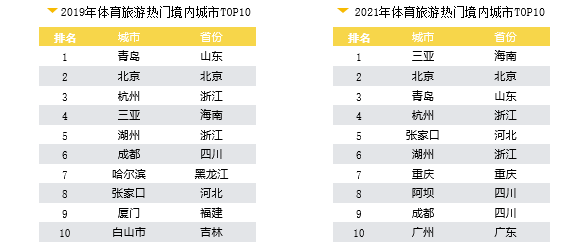 多元化体育旅游品牌满足游客高品质生活需要。根据热门游玩地及其所属目的地数据显示,2019年和2021年水上运动目的地青岛帆船中心居于榜首,随着帆船、冲浪运动热度上涨,2021年三亚帆船港跃居第二,排名前十位中,冲浪俱乐部占据四位。山东、海南、广东等省份的滨海城市一直是水上运动的热门目的地。随着潜水运动的普及,越来越多的游客被深潜、浮潜、自由浅、潜水考证、水下拍照等不同体验吸引,使三亚作为水上运动目的地首选城市,整体热度稳居第一。