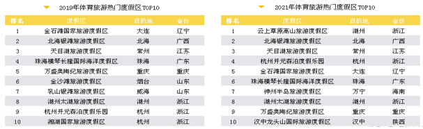 根据热门度假区及其所属目的地数据显示,相比2019年华东、华南区域度假区热度攀升。2021年,云上草原高山旅游度假区以其悬空栈桥、玻璃栈道、滑翔伞、悬崖秋千、彩虹滑草、空中自行车、悬崖攀岩等网红休闲游乐项目,以及夏避暑秋登山冬滑雪等各种适合团建的运动项目,成功跃居“受欢迎休闲度假区”首位。北海银滩、天目湖等以传统海滨、温泉为主的度假区吸引着亲子家庭游,热度依然不减。杭州开元森泊度假乐园,以其木屋民宿和水乐园的“一站式”度假村,在2021年爆红江浙沪。星空木屋、恒温水乐园、天鹅羊驼相伴等,让游客推窗就是绿树茶林,鸟语花香,感受大森林的奇妙乐趣,满足游客住进森林里秘境的美好童话幻想。