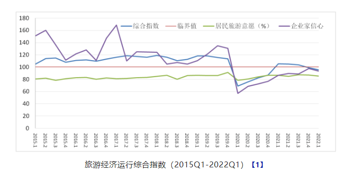 中国旅游研究院(文化和旅游部数据中心)季度发布会今日在线举行。我院戴斌院长发表题为《听见的声音看到的信心》主题演讲,全文如下:一、稳开低收的市场与波动收缩的消费受宏观经济、产业政策和春节假日消费回暖的影响,2022年元旦到春节的旅游市场呈现出稳开缓升的复苏迹象。2月下旬开始,多点散发和局部地区规模爆发的新冠疫情,导致旅游出游人次和旅游消费等主要指标明显弱于去年同期,吉林、上海等地的旅游消费更是走出了疫情以来的新低。由于缺乏需求侧和市场面的配合,面向供给侧和产业面的财政、金融和社会保障政策,短期内无法获得预期效应。从宏观数据看,一季度的旅游经济运行综合指数(CTA—TEP)为95.60,同比和环比分别下降了9.7和3.3,处于景气荣枯线以下并呈持续下降趋势。与此同时,企业家信心和城乡居民的旅游意愿进入波动下行区间,系统内外和行业社会对旅游业也投入出了前所未所有的关注。过去的100天,无论是理性的探讨、宏观的政策设计,还是情绪化的观点表达,我们听见了所有应当被听见的声音,也看到坚持就是胜利的信心。