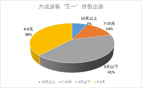 今年“五一”,拼假和错峰出游成趋势。从携程自由行、跟团游产品的统计看,41%的游客选择3天内的行程,38%选择4到6天;选择一周以上的有21%,六成游客拼假出游。从出发日期统计看,节前两天出发的游客占了37%。“五一”假期前两天出行的客流最集中,占了51%。为了错开客流高峰、同时享受优惠价格,越来越多的人主动错峰或者淡季出游。与此同时,通过法定程序增加公共假日延长五一假期成民众呼声。调查数据显示,我国带薪休假制度实际落实比率仅5成,群众愿意通过带薪休假出行旅游的比例超过80%,实际利用带薪休假出游的职工仅为30%。增加法定假日,可更好地满足群众美好生活向往。