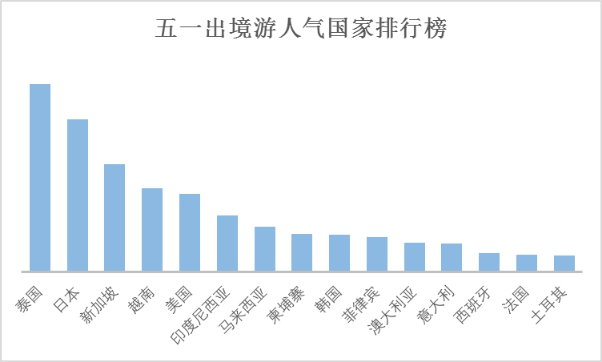 假日假期,携程数据显示, 最受欢迎、游客选择最多的国内前十大旅游城市是:北京、上海、重庆、杭州、昆明、成都、西安、广州、南京、拉萨;游客选择最多的国内前十大休闲度假目的地依次是:三亚、厦门、桂林、丽江、张家界、九寨沟、黄山、乌镇、稻城、舟山; 人气最高的出境游目的地国家Top15分别为:泰国、日本、新加坡、越南、美国、印度尼西亚、马来西亚、柬埔寨、韩国、菲律宾、澳大利亚、意大利、西班牙、法国、土耳其,国内外热门目的地和景区等承载经受考验,旅游市场平稳有序运行。各级文化和旅游主管部门坚守岗位,发布假日旅游指南,对旅游秩序实地督导检查,实施大数据监控、分析预警、联动应急处置,文化市场举报热线12318、旅游服务热线12301全天在线,文化和旅游市场未发生全国性突发事件和重大负面舆情。中国旅游研究院长期监测的假期旅游服务质量动态数据显示,五一期间旅游部分景区为游客提供温情服务,旅游目的地和核心业态服务品质总体明显提升。