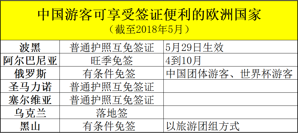 签证方面,今年对中国游客提供入境便利待遇的欧洲国家达7个。阿尔巴尼亚宣布对中国公民实施旅游旺季免签(4到10月)。中国和波黑持普通护照公民互免签证将于5月29日正式生效。俄罗斯对中国团体游客和参观世界杯的旅游者免签。此前圣马力诺、塞尔维亚已经针对中国游客免签,乌克兰开放落地签。黑山对旅行社组团方式的中国游客有条件免签。