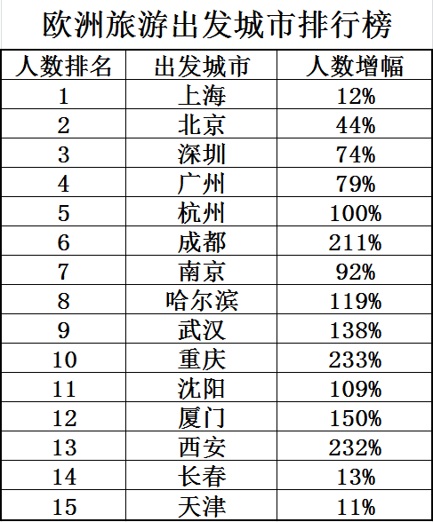 一线城市依旧是欧洲旅游的主要客源地,但相比去年同期,前四名变成“上、北、深、广”,深圳超过广州位居第三。增幅最快的则是成都、杭州、武汉、重庆、西安、厦门、沈阳、哈尔滨、南京等新一线城市,成为欧洲游的重要新兴口岸。携程欧洲游数据显示,一季度这些城市欧洲游的增幅达到100%到200%,也为中国游客赴欧旅游提供更多便捷。