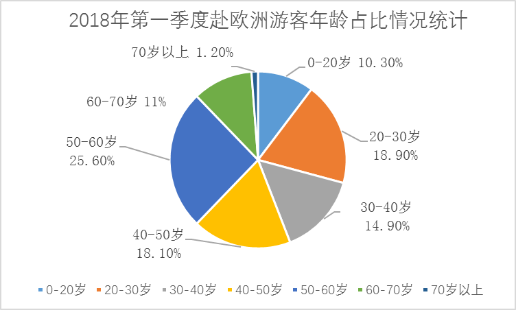 从第一季度游客的性别年龄分析来看,赴欧洲游客女性居多,占总人次的60.4%。50-60岁人群占比25.6%,比例最高。其次是以90后为主的20岁到30岁人群,占比18.9%,排名第二,比例持续上升。40岁到50岁年龄段占了18.1%,位列第三。
