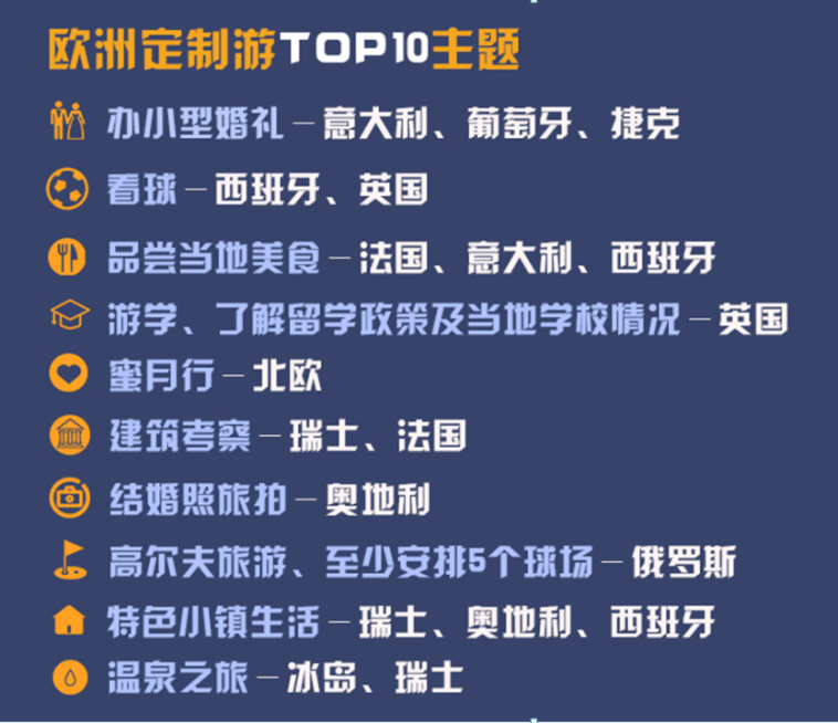 根据游客的定制需求单,十大欧洲定制游主题备受关注: 办小型婚礼、看球赛、品尝当地美食、游学、留学考察、蜜月行、建筑考察、结婚照旅拍、高尔夫旅游、特色小镇生活、温泉之旅。目前,携程欧洲定制游业务增长迅猛,已占出境定制游整体10%,近一年需求单量同比增长130%,花费平均在每人每天2500元,远高于整体市场增速。