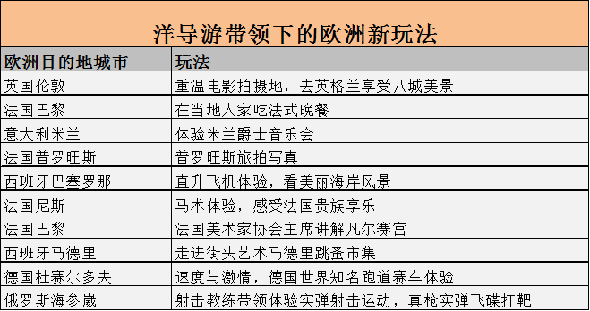 中国游客出境游旅游呈现深度化、个性化趋势,常规的景点观光游已不能完全满足游客个性化的需求。今年欧洲游涌现出一批时尚新玩法,找一名熟悉当地、讲中文的当地向导带着玩,成为当下流行趋势。旅游者可以通过德国的“洋向导”体验知名赛车跑道的速度与激情,去法国尼斯体验马术,去伦敦重温经典老电影拍摄地。
