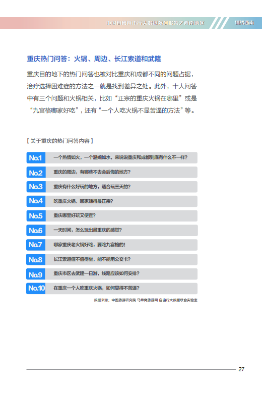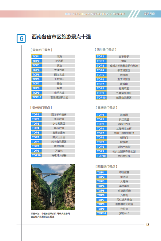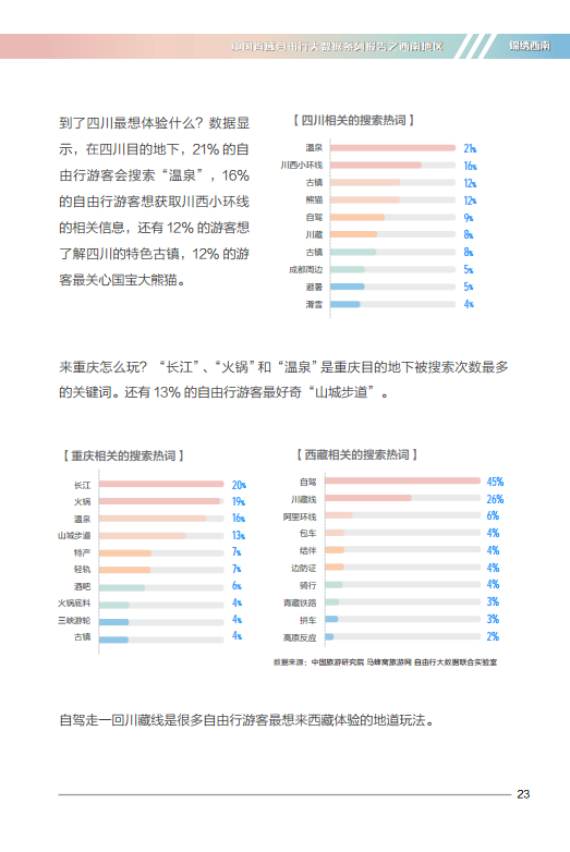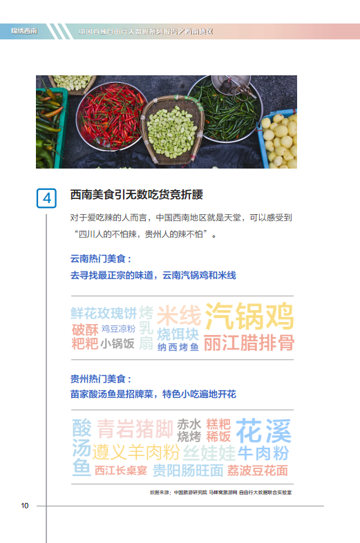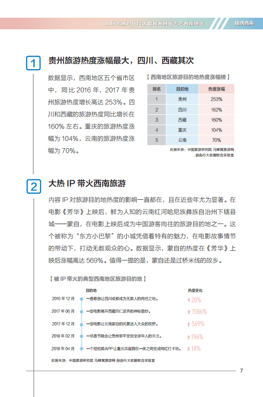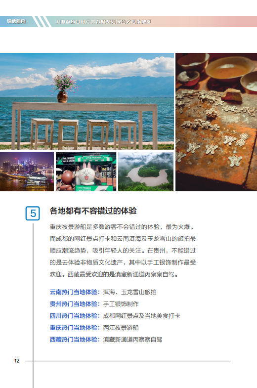 该报告以双方旅游大数据为基础,深度剖析了中国西南地区五省区市——云南、贵州、四川、重庆、西藏的旅游市场现状与未来发展趋势。报告显示,西南五省区市的旅游热度近年有大幅增长,自驾、古镇、美食成为西南地区最受旅行者关注的关键词。报告全文如下: