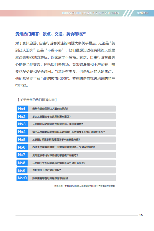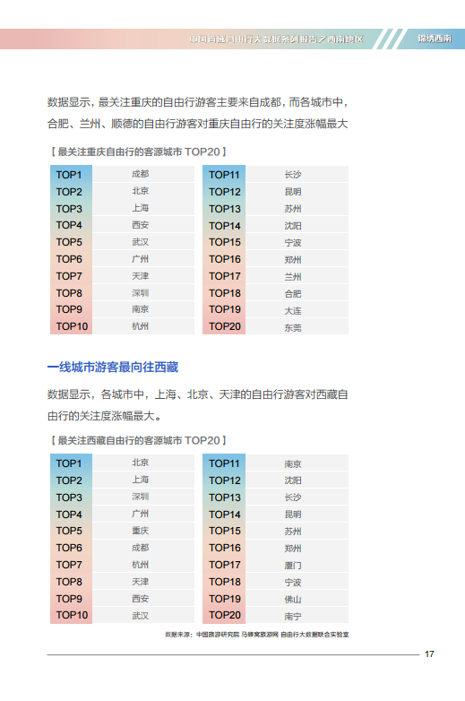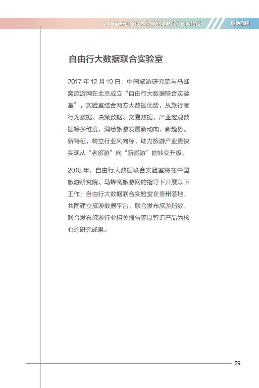 中国旅游研究院戴斌院长指出:随着消费经验的成熟,特别是智慧旅行的普及,自主化决策、自助旅游、自由行已经成为当前和今后一个时期旅游市场的基本特征。2018年5月24日,中国旅游研究院与马蜂窝旅游网联合成立的“自由行大数据联合实验室”发布了《锦绣西南——中国省域自由行大数据系列报告之西南地区》。