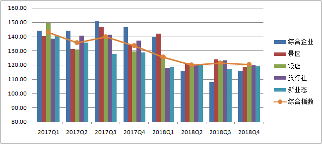 产业运行较为景气。2018年全年,受企业家信心、产品价格、营业收入、营业成本等方面不利预期影响,各季度旅游产业景气指数分别为125.5、120.0、121.4和120.35,与去年同期下降,但仍然在“较为景气”区间运行。从分行业景气指数来看,旅游景区、旅游住宿和旅游新业态明显好于旅游集团和传统旅行社。从产业要素和发展动能来看,从业人员、固定资产投资仍然保持增长趋势。